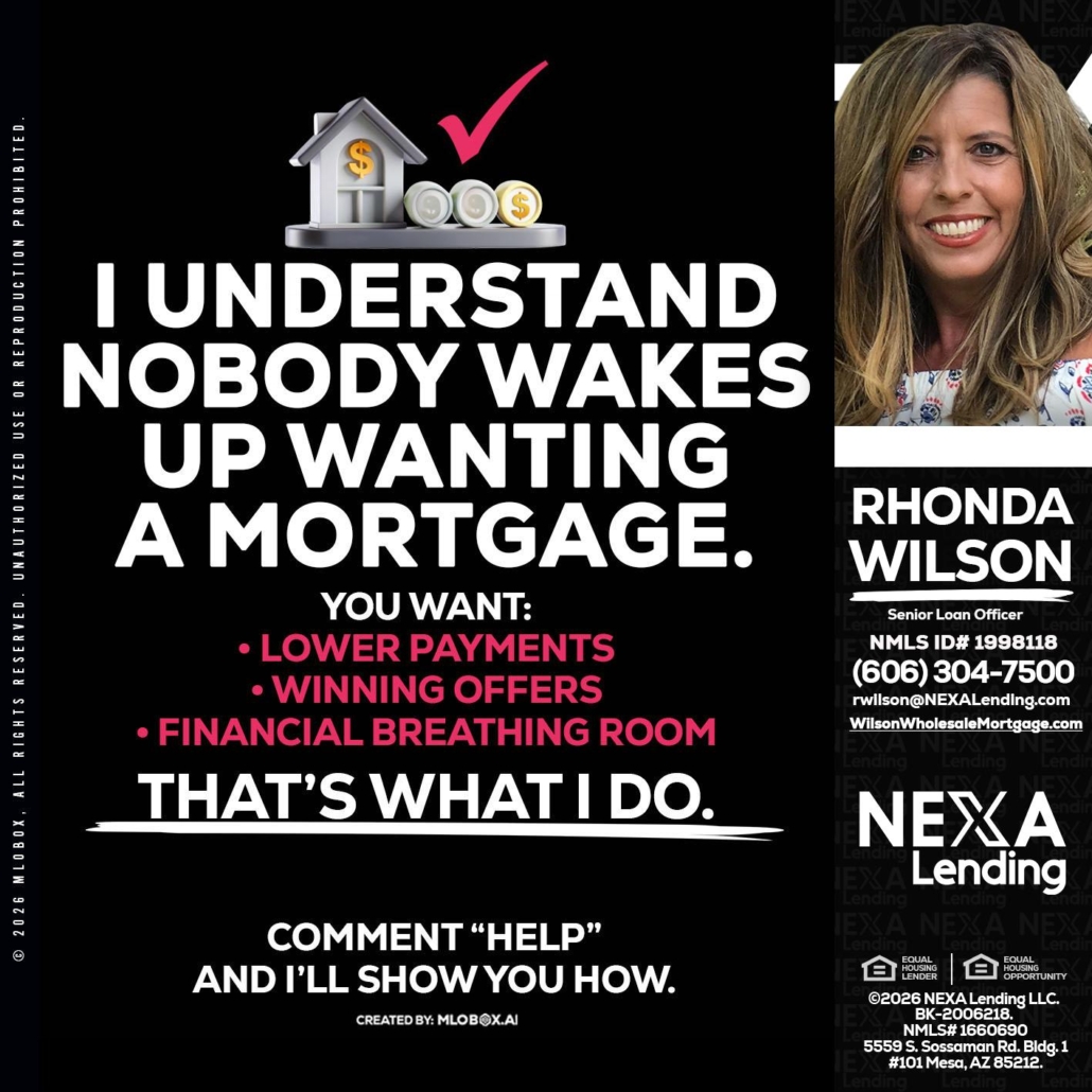 I UNDERSTAND - Rhonda Wilson -Senior Loan OfficerHi, my name is Rhonda Wilson. I’m a Loan Officer with NEXA Lending LLC., offering personalized mortgage solutions, fast customized quotes, great rates and service with integrity.