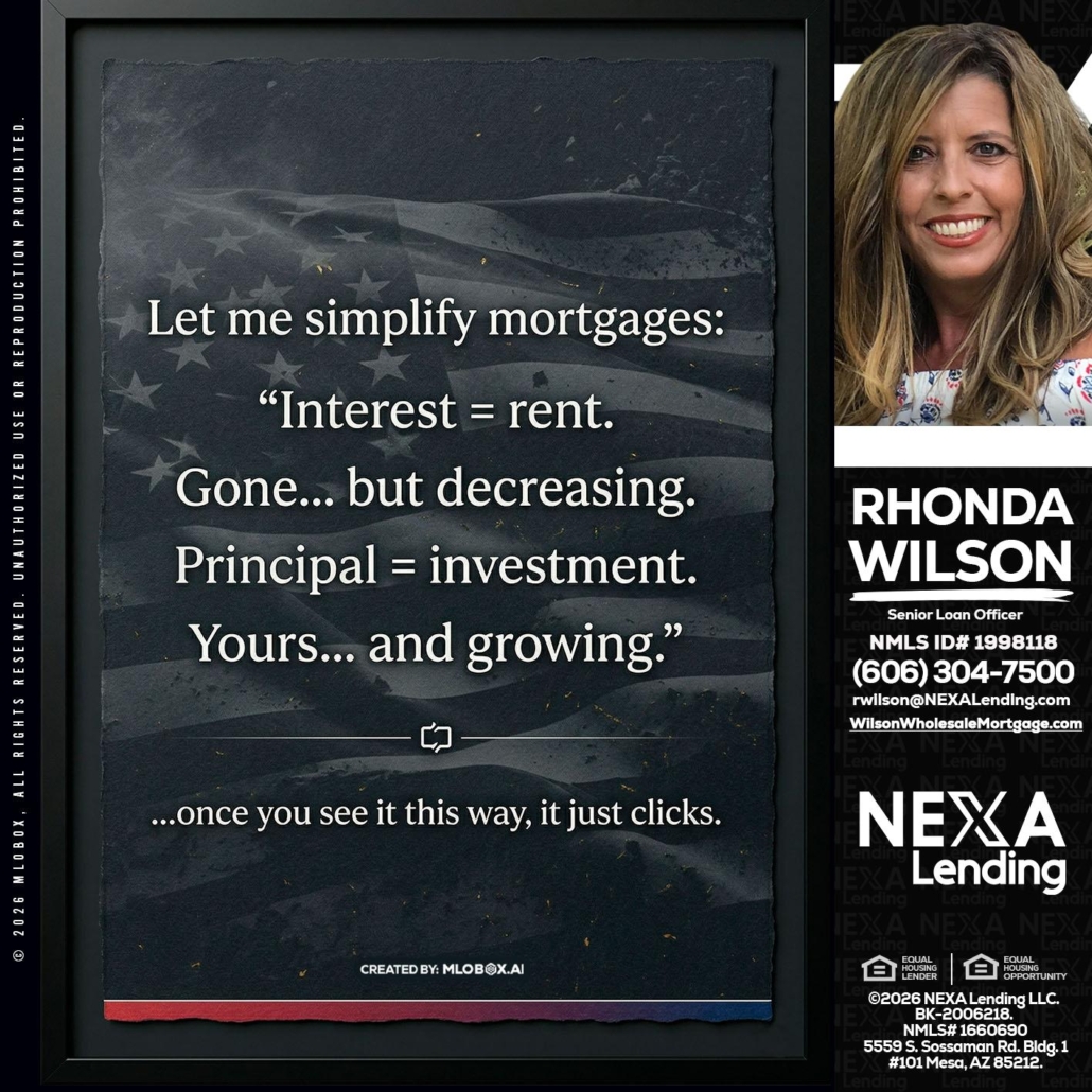 LET ME SIMPLIFY - Rhonda Wilson -Senior Loan OfficerHi, my name is Rhonda Wilson. I’m a Loan Officer with NEXA Lending LLC., offering personalized mortgage solutions, fast customized quotes, great rates and service with integrity.