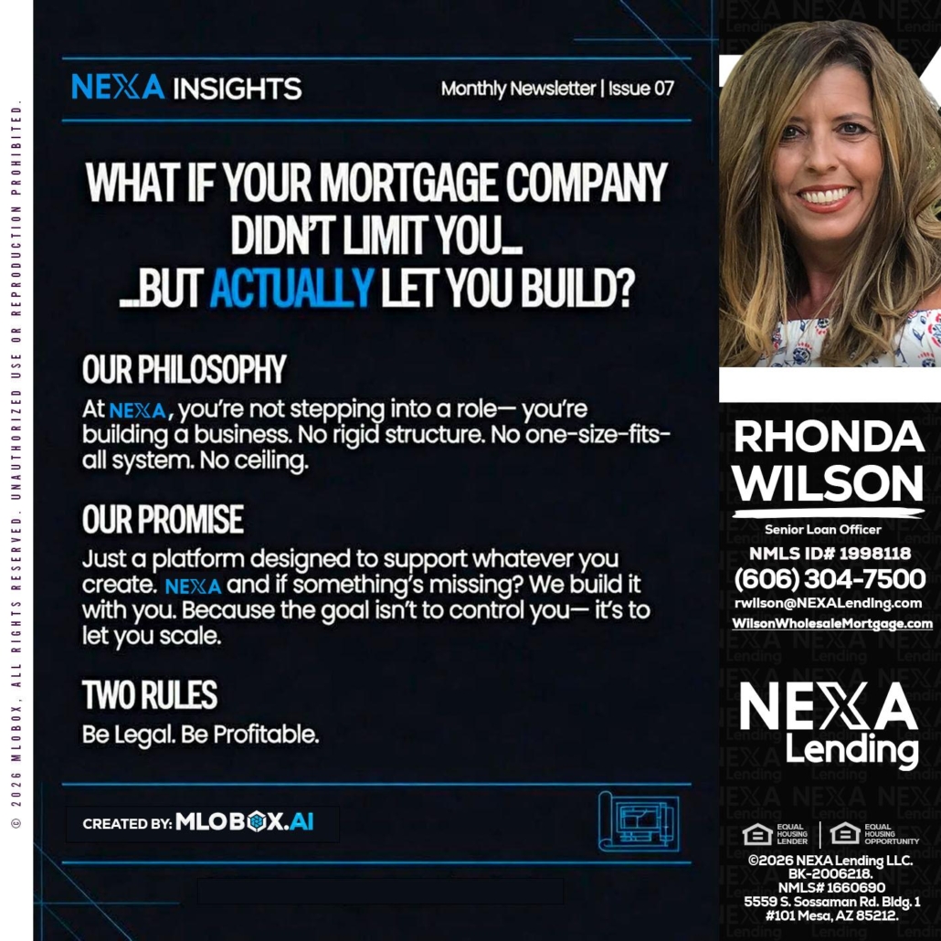 Hi, my name is Rhonda Wilson. I’m a Loan Officer with NEXA Lending LLC., offering personalized mortgage solutions, fast customized quotes, great rates and service with integrity.