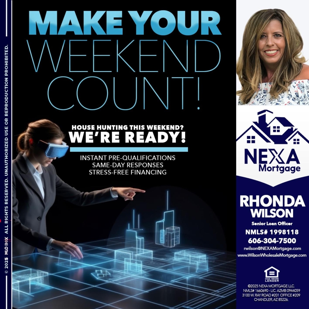 Hi, my name is Rhonda Wilson. I’m a Loan Officer with NEXA Mortgage LLC., offering personalized mortgage solutions, fast customized quotes, great rates and service with integrity.